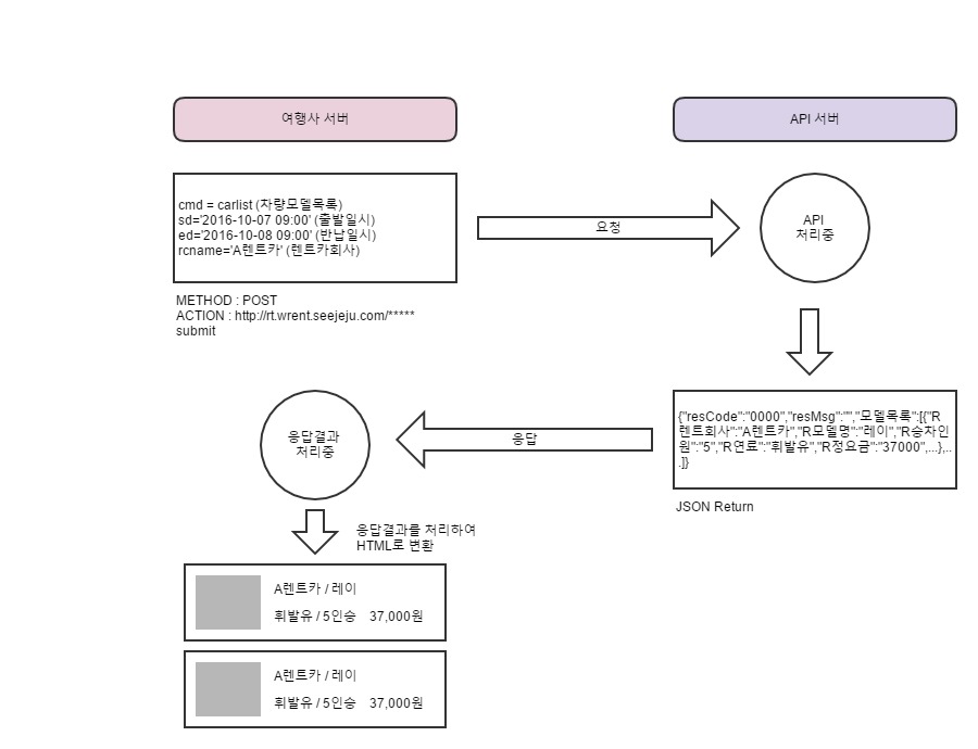 여행사의 웹사이트에서 여러 렌트카 회사의 렌트카 차량목록/가격비교, 예약가능여부 조회 및 예약접수를 할 수 있게 도와주는 서비스입니다. 웹 요청방식이며 필요한 값을 전송받고 그에 대한 데이터를 응답하는 구조입니다.